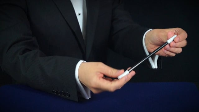 Secret: For this trick, you will need your wand. Grip your left wrist with your right hand so that you can hold the wand against your left palm with your right index finger, as the pictures show.